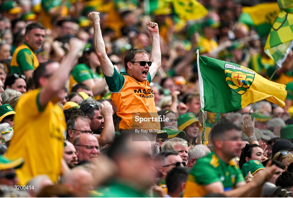 27 July 2025; Donegal supporters celebrate a score during the GAA Football All-Ireland Senior Championship final match between Kerry and Donegal at Croke Park in Dublin. Photo by Ray McManus/Sportsfile