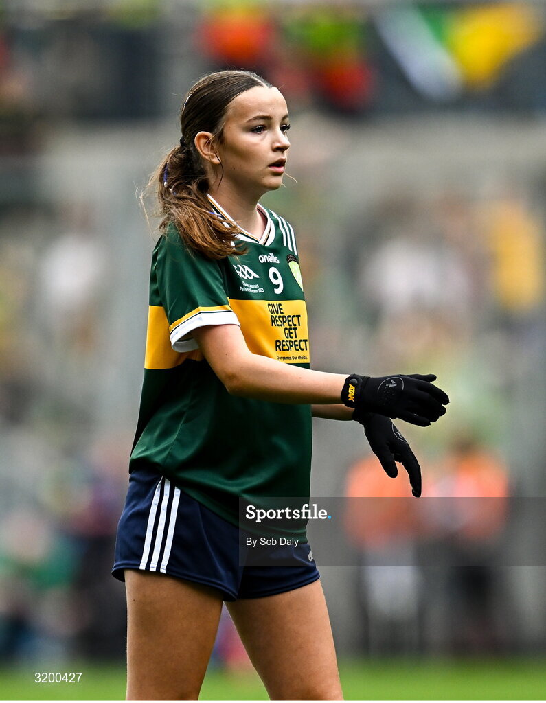 27 July 2025; Emily Kavanagh, St Colman's NS, Mucklagh, Offaly, representing Kerry, during the GAA INTO Cumann na mBunscol Respect Exhibition Go Games at the GAA Football All-Ireland Senior Championship final match between Kerry and Donegal at Croke Park in Dublin. Photo by Seb Daly/Sportsfile