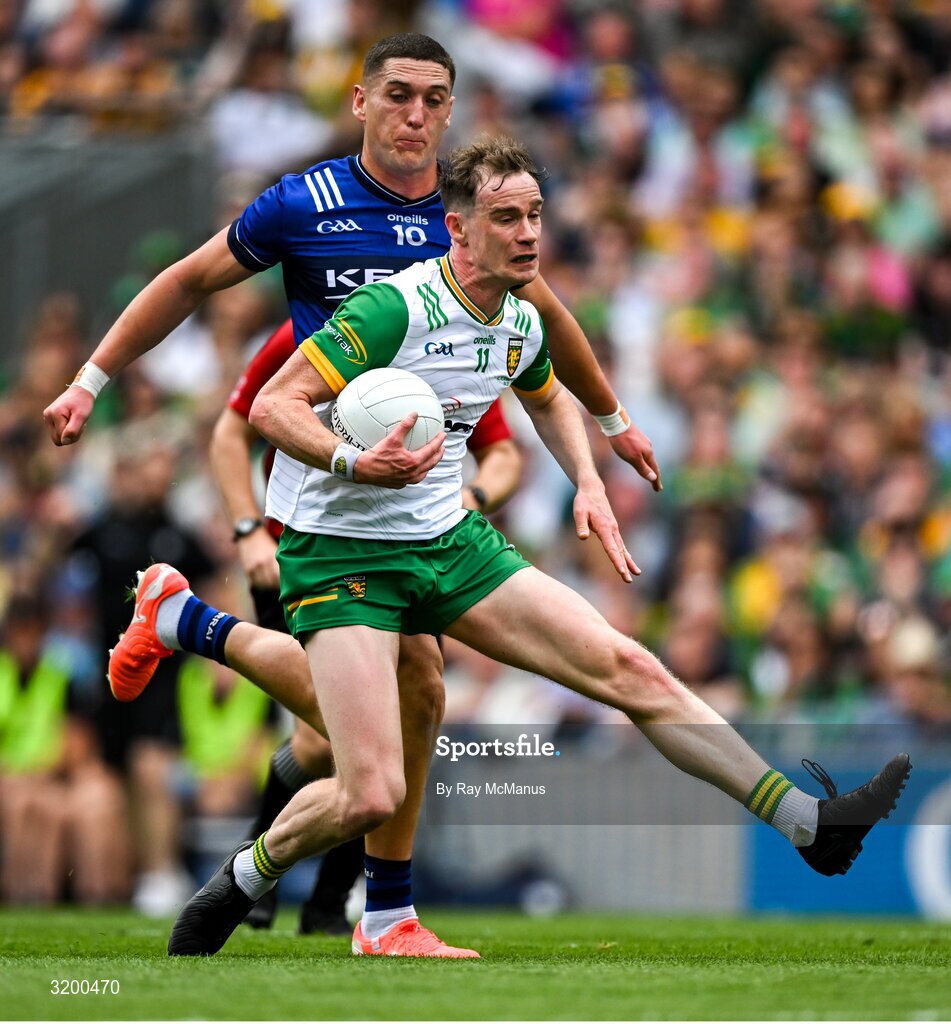27 July 2025; Ciaran Thompson of Donegal in action against Joe O'Connor of Kerry during the GAA Football All-Ireland Senior Championship final match between Kerry and Donegal at Croke Park in Dublin. Photo by Ray McManus/Sportsfile