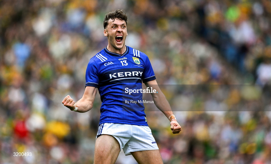 27 July 2025; David Clifford of Kerry celebrates a late goal, scored by Joe O'Connor, during the GAA Football All-Ireland Senior Championship final match between Kerry and Donegal at Croke Park in Dublin. Photo by Ray McManus/Sportsfile