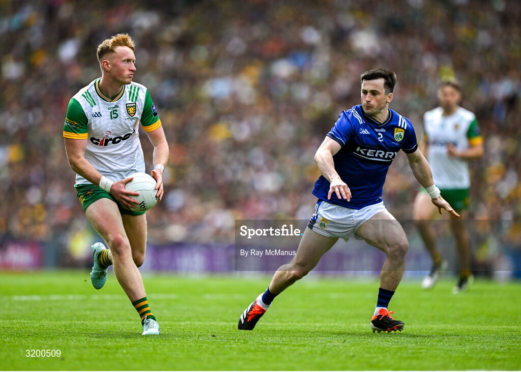 27 July 2025; Oisin Gallen of Donegal in action against Paul Murphy of Kerry during the GAA Football All-Ireland Senior Championship final match between Kerry and Donegal at Croke Park in Dublin. Photo by Ray McManus/Sportsfile