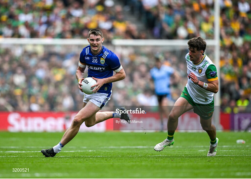 27 July 2025; Diarmuid O'Connor of Kerry in action against Jamie Brennan of Donegal during the GAA Football All-Ireland Senior Championship final match between Kerry and Donegal at Croke Park in Dublin. Photo by Ray McManus/Sportsfile