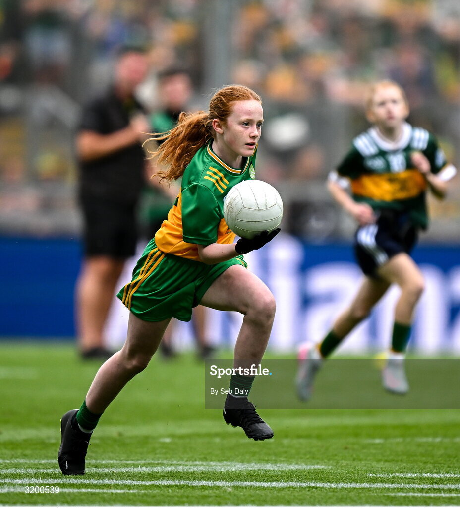 27 July 2025; Úna Kilkenny, St Mary's PS, Mullaghbawn, Armagh, representing Donegal, during the GAA INTO Cumann na mBunscol Respect Exhibition Go Games at the GAA Football All-Ireland Senior Championship final match between Kerry and Donegal at Croke Park in Dublin. Photo by Seb Daly/Sportsfile