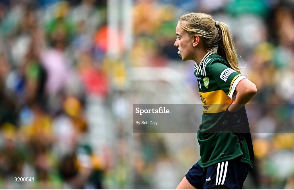 27 July 2025; Bláthnaid Ní Mhochán, Scoil Lachtaín Naofa, Cill na Martra, Cork, representing Kerry, during the GAA INTO Cumann na mBunscol Respect Exhibition Go Games at the GAA Football All-Ireland Senior Championship final match between Kerry and Donegal at Croke Park in Dublin. Photo by Seb Daly/Sportsfile