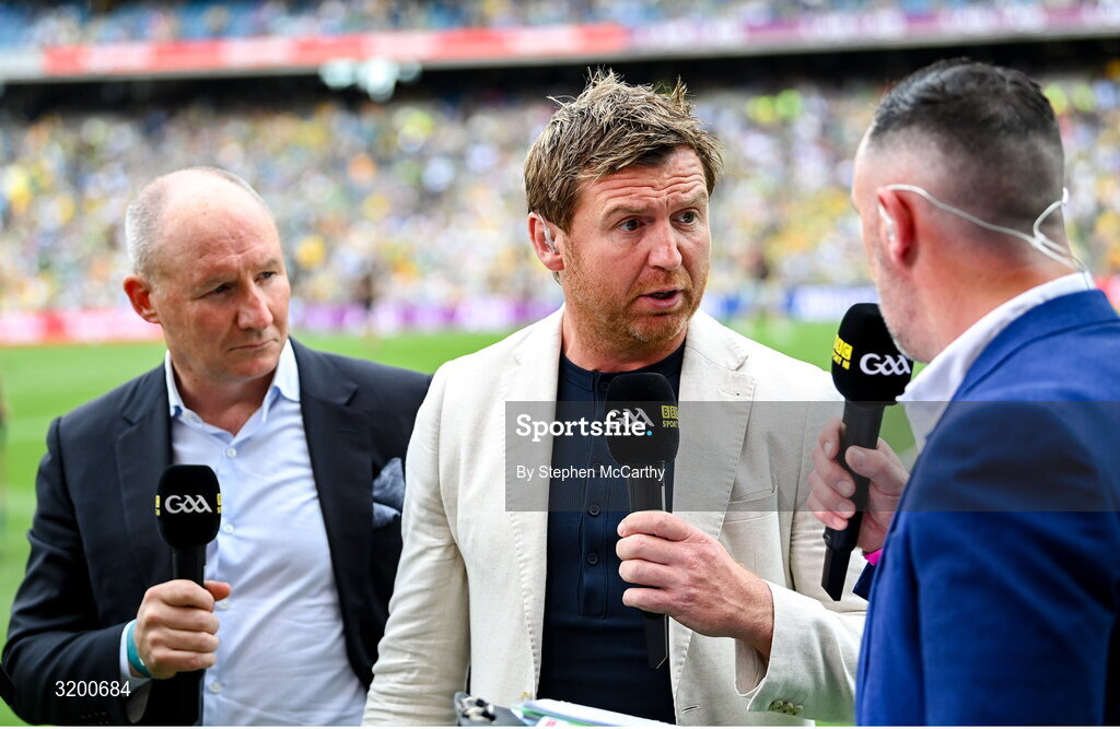 27 July 2025; BBC Sport analysts Owen Mulligan and Jim Gavin, left, during the GAA Football All-Ireland Senior Championship final match between Kerry and Donegal at Croke Park in Dublin. Photo by Stephen McCarthy/Sportsfile