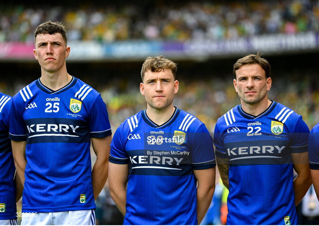 27 July 2025; Kerry players, from left, Tomás Kennedy, Dara Moynihan and Micheál Burns before the GAA Football All-Ireland Senior Championship final match between Kerry and Donegal at Croke Park in Dublin. Photo by Stephen McCarthy/Sportsfile