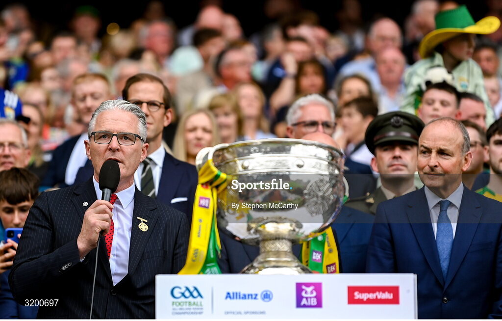 27 July 2025; Uachtarán Chumann Lúthchleas Gael Jarlath Burns makes a speech before presenting the Sam Maguire cup as An Taoiseach Micheál Martin TD watches on after the GAA Football All-Ireland Senior Championship final match between Kerry and Donegal at Croke Park in Dublin. Photo by Stephen McCarthy/Sportsfile