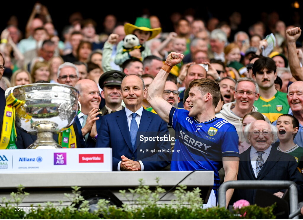 27 July 2025; Kerry captain Gavin White celebrates before lifting the Sam Maguire cup after the GAA Football All-Ireland Senior Championship final match between Kerry and Donegal at Croke Park in Dublin. Photo by Stephen McCarthy/Sportsfile