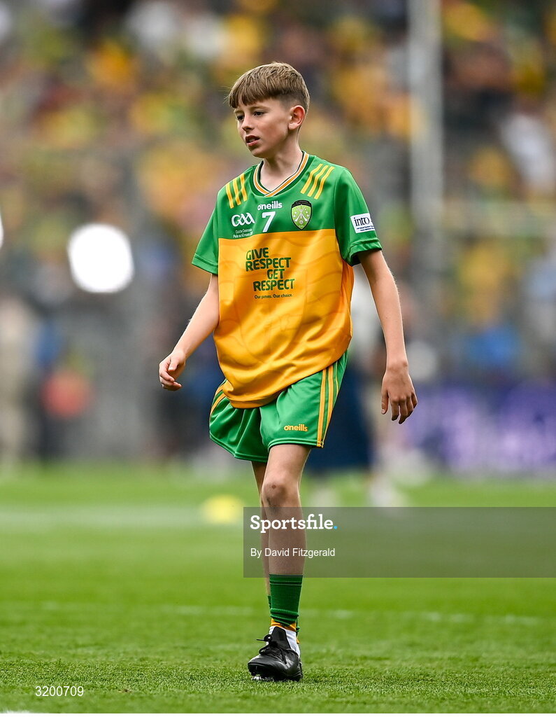 27 July 2025; Seanie Gallagher, Enniskillen Integrated PS, Enniskillen, Fermanagh, representing Donegal during the GAA INTO Cumann na mBunscol Respect Exhibition Go Games at the GAA Football All-Ireland Senior Championship final match between Kerry and Donegal at Croke Park in Dublin. Photo by David Fitzgerald/Sportsfile