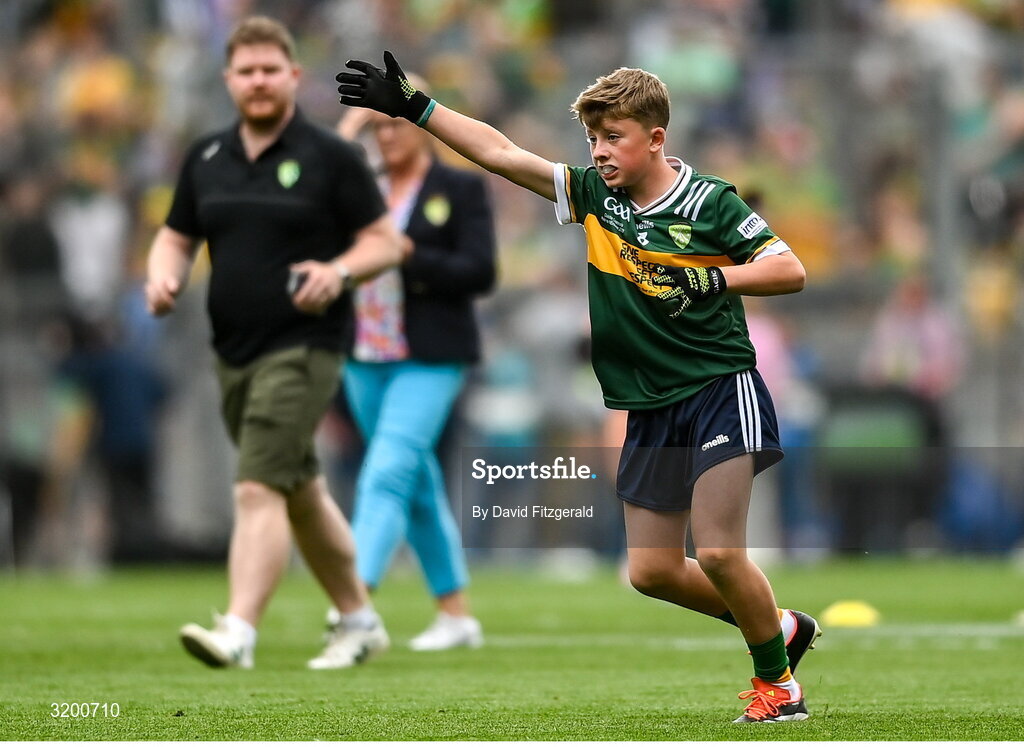 27 July 2025; Jamie Henry, Collon NS, Collon, Louth, representing Kerry during the GAA INTO Cumann na mBunscol Respect Exhibition Go Games at the GAA Football All-Ireland Senior Championship final match between Kerry and Donegal at Croke Park in Dublin. Photo by David Fitzgerald/Sportsfile