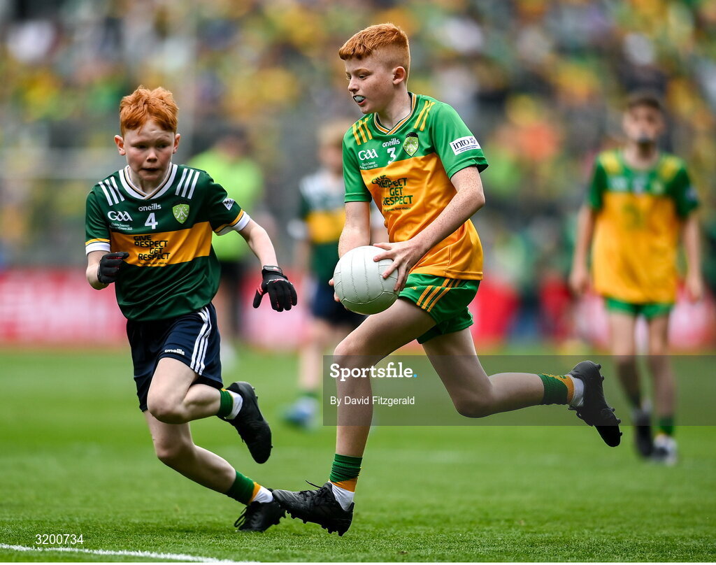 27 July 2025; Daithí Farrell, Scoil Bhríde, Fourmilehouse, Roscommon, representing Donegal in action against Michael Kenny, Casey Cloneen NS, Clonmel, Tipperary, representing Kerry during the GAA INTO Cumann na mBunscol Respect Exhibition Go Games at the GAA Football All-Ireland Senior Championship final match between Kerry and Donegal at Croke Park in Dublin. Photo by David Fitzgerald/Sportsfile