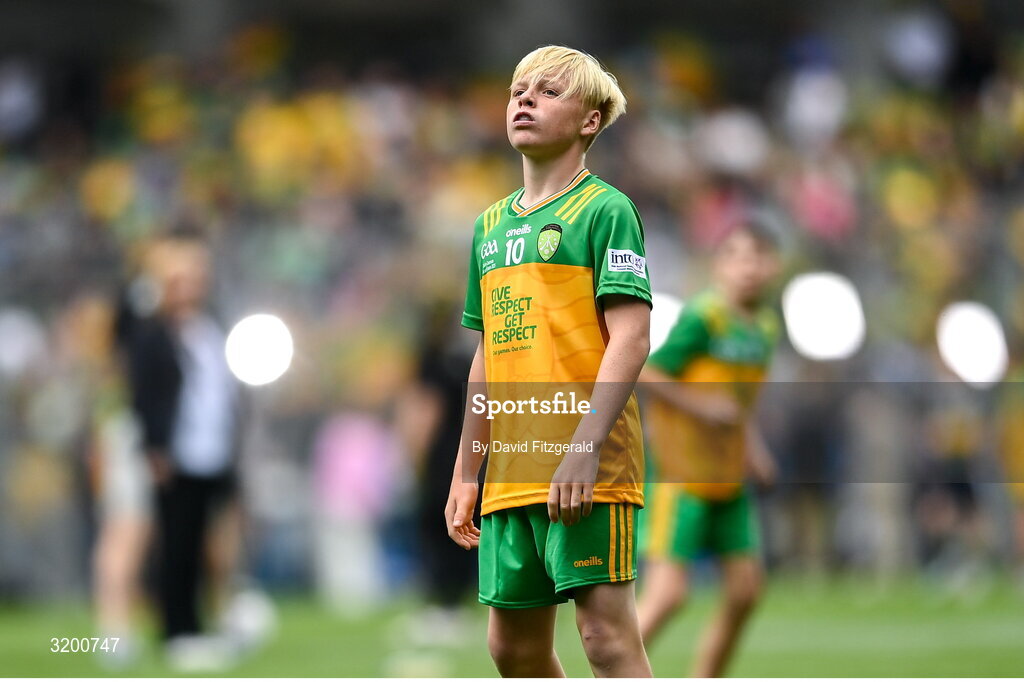 27 July 2025; Callan McGovern, St Kilian's SNS, Tallaght, Dublin, representing Donegal during the GAA INTO Cumann na mBunscol Respect Exhibition Go Games at the GAA Football All-Ireland Senior Championship final match between Kerry and Donegal at Croke Park in Dublin. Photo by David Fitzgerald/Sportsfile