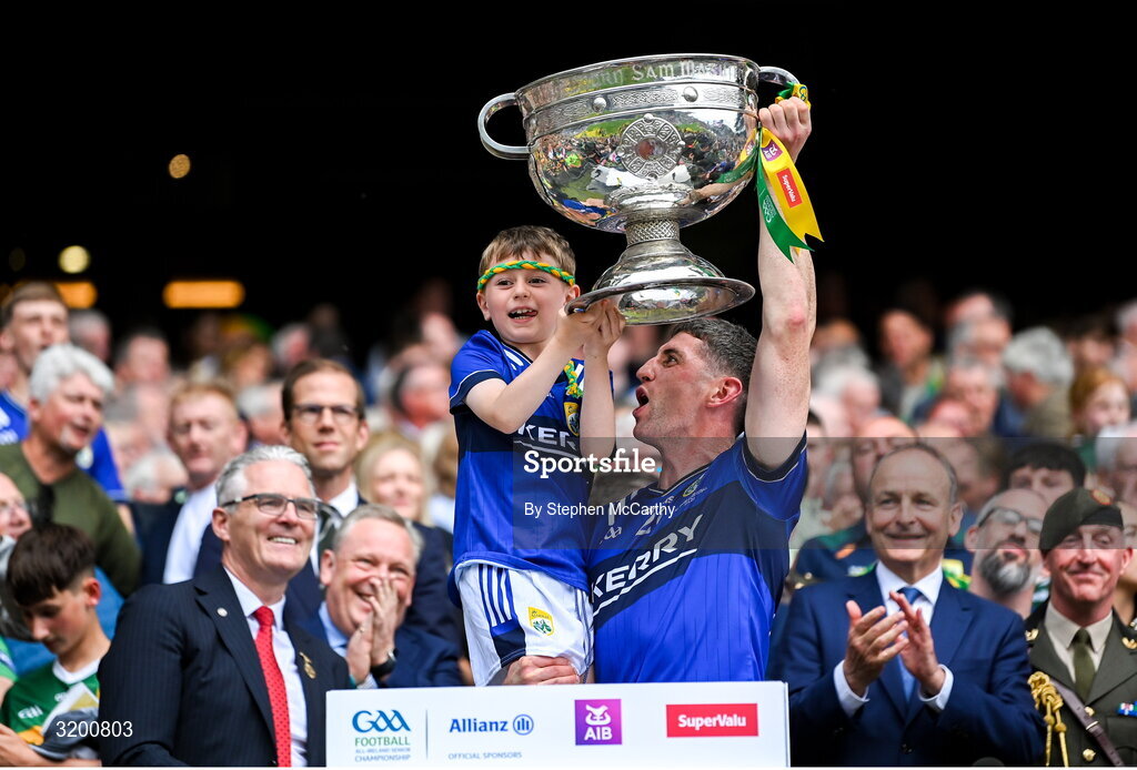 27 July 2025; Paul Geaney of Kerry and his son Paidi lift the Sam Maguire cup in celebration following their side's victory in the GAA Football All-Ireland Senior Championship final match between Kerry and Donegal at Croke Park in Dublin. Photo by Stephen McCarthy/Sportsfile