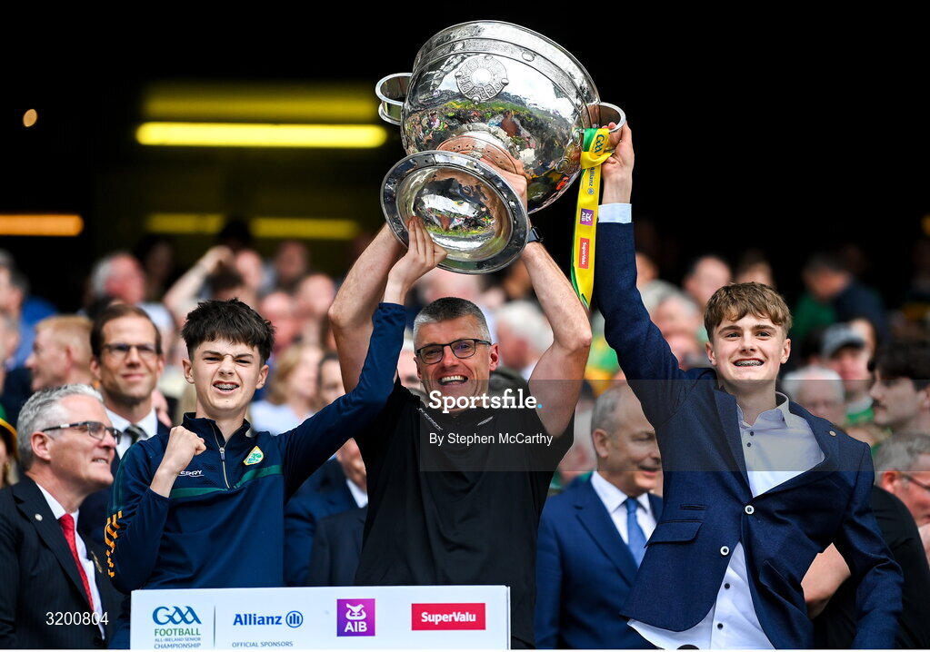 27 July 2025; Kerry selector Aodán Mac Gearailt lifts the Sam Maguire cup in celebration following their side's victory in the GAA Football All-Ireland Senior Championship final match between Kerry and Donegal at Croke Park in Dublin. Photo by Stephen McCarthy/Sportsfile
