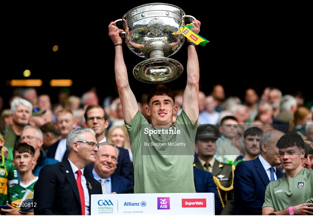 27 July 2025; Cillian Trant of Kerry lifts the Sam Maguire cup in celebration following their side's victory in the GAA Football All-Ireland Senior Championship final match between Kerry and Donegal at Croke Park in Dublin. Photo by Stephen McCarthy/Sportsfile