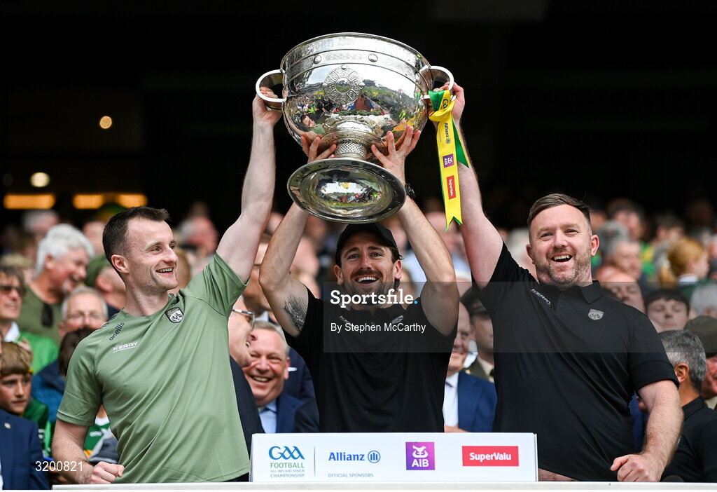 27 July 2025; Kerry's Tom O'Sullivan, left, nutritionist John O'Connor, centre, and strength and conditioning coach Mark Evans, right, lift the Sam Maguire cup in celebration following their side's victory in the GAA Football All-Ireland Senior Championship final match between Kerry and Donegal at Croke Park in Dublin. Photo by Stephen McCarthy/Sportsfile
