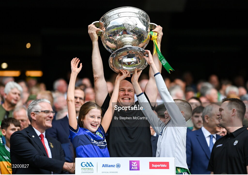 27 July 2025; Kerry selector James Costello lifts the Sam Maguire cup in celebration following their side's victory in the GAA Football All-Ireland Senior Championship final match between Kerry and Donegal at Croke Park in Dublin. Photo by Stephen McCarthy/Sportsfile