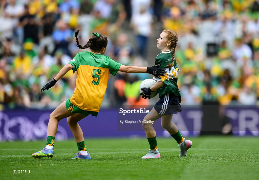 27 July 2025; Bailee Bolton, St Fiacc's NS, Graiguecullen, Laois, representing Kerry, and Grace McGonigle, Gaelscoil Cois Feabhaill, Moville, Donegal, during the GAA INTO Cumann na mBunscol Respect Exhibition Go Games at the GAA Football All-Ireland Senior Championship final match between Kerry and Donegal at Croke Park in Dublin. Photo by Stephen McCarthy/Sportsfile