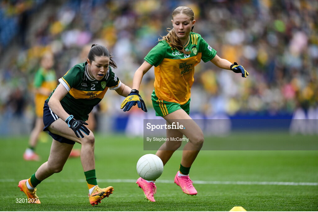 27 July 2025; Ella Roche, Moveen NS, Kilkee, Clare, representing Kerry, and Rebecca Farrell, St Patrick's NS, Castleknock, Dublin, representing Donegal, during the GAA INTO Cumann na mBunscol Respect Exhibition Go Games at the GAA Football All-Ireland Senior Championship final match between Kerry and Donegal at Croke Park in Dublin. Photo by Stephen McCarthy/Sportsfile