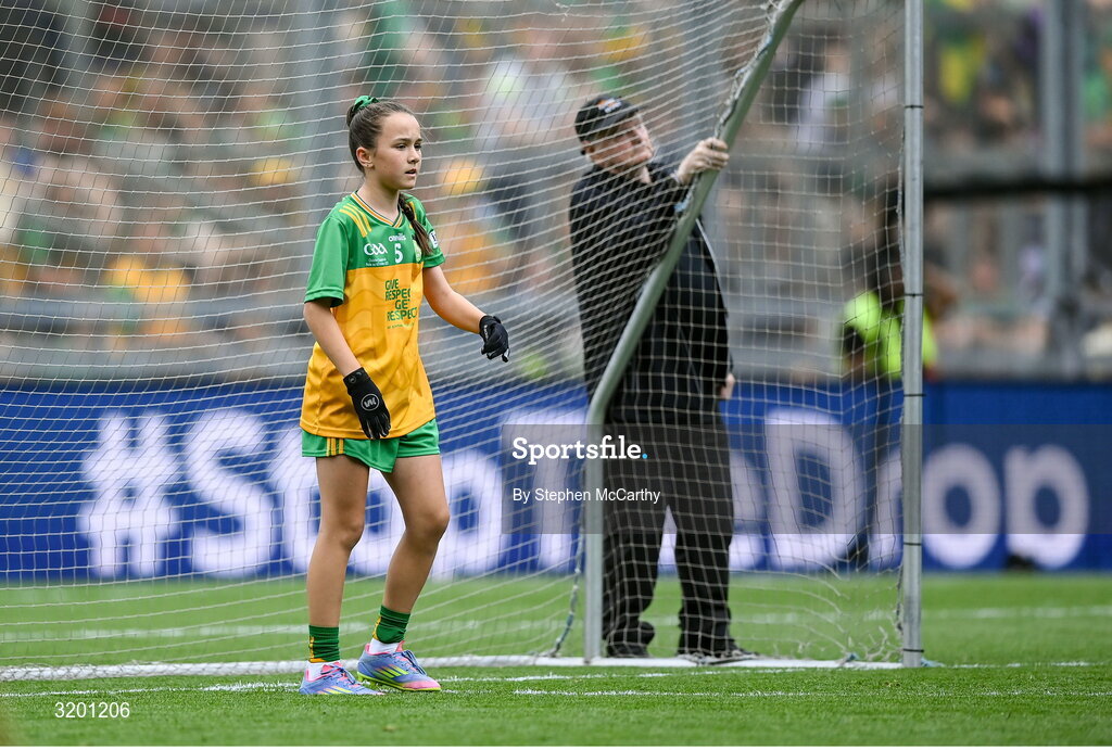 27 July 2025; Grace McGonigle, Gaelscoil Cois Feabhaill, Moville, Donegal, during the GAA INTO Cumann na mBunscol Respect Exhibition Go Games at the GAA Football All-Ireland Senior Championship final match between Kerry and Donegal at Croke Park in Dublin. Photo by Stephen McCarthy/Sportsfile