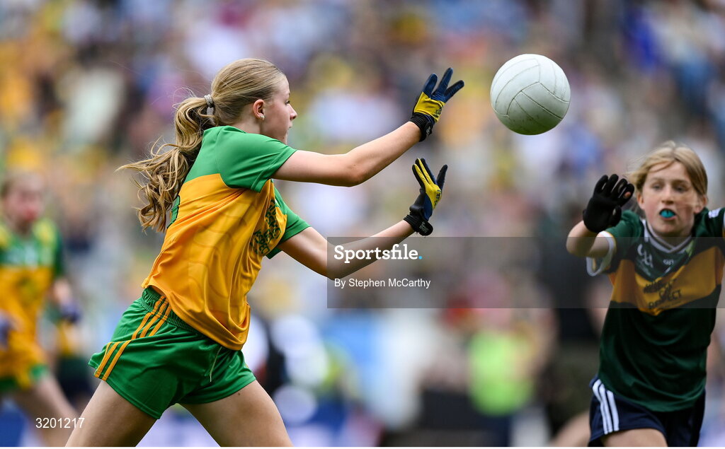 27 July 2025; Rebecca Farrell, St Patrick's NS, Castleknock, Dublin, representing Donegal, during the GAA INTO Cumann na mBunscol Respect Exhibition Go Games at the GAA Football All-Ireland Senior Championship final match between Kerry and Donegal at Croke Park in Dublin. Photo by Stephen McCarthy/Sportsfile