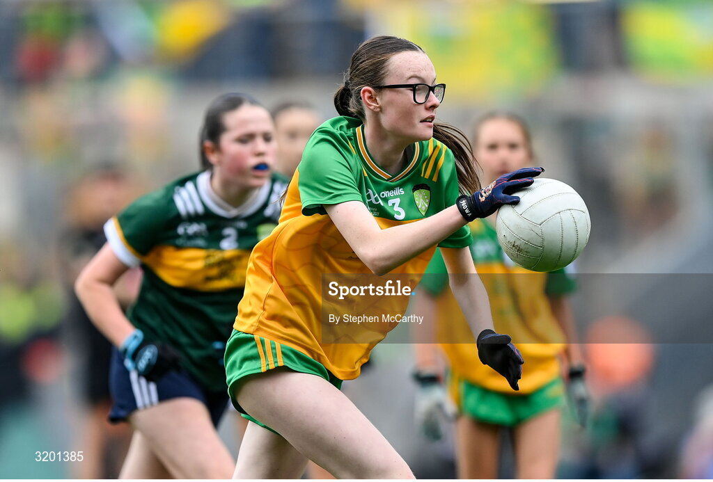 27 July 2025; Teegan Fahy, Clonberne NS, Clonberne, Galway, representing Donegal, during the GAA INTO Cumann na mBunscol Respect Exhibition Go Games at the GAA Football All-Ireland Senior Championship final match between Kerry and Donegal at Croke Park in Dublin. Photo by Stephen McCarthy/Sportsfile