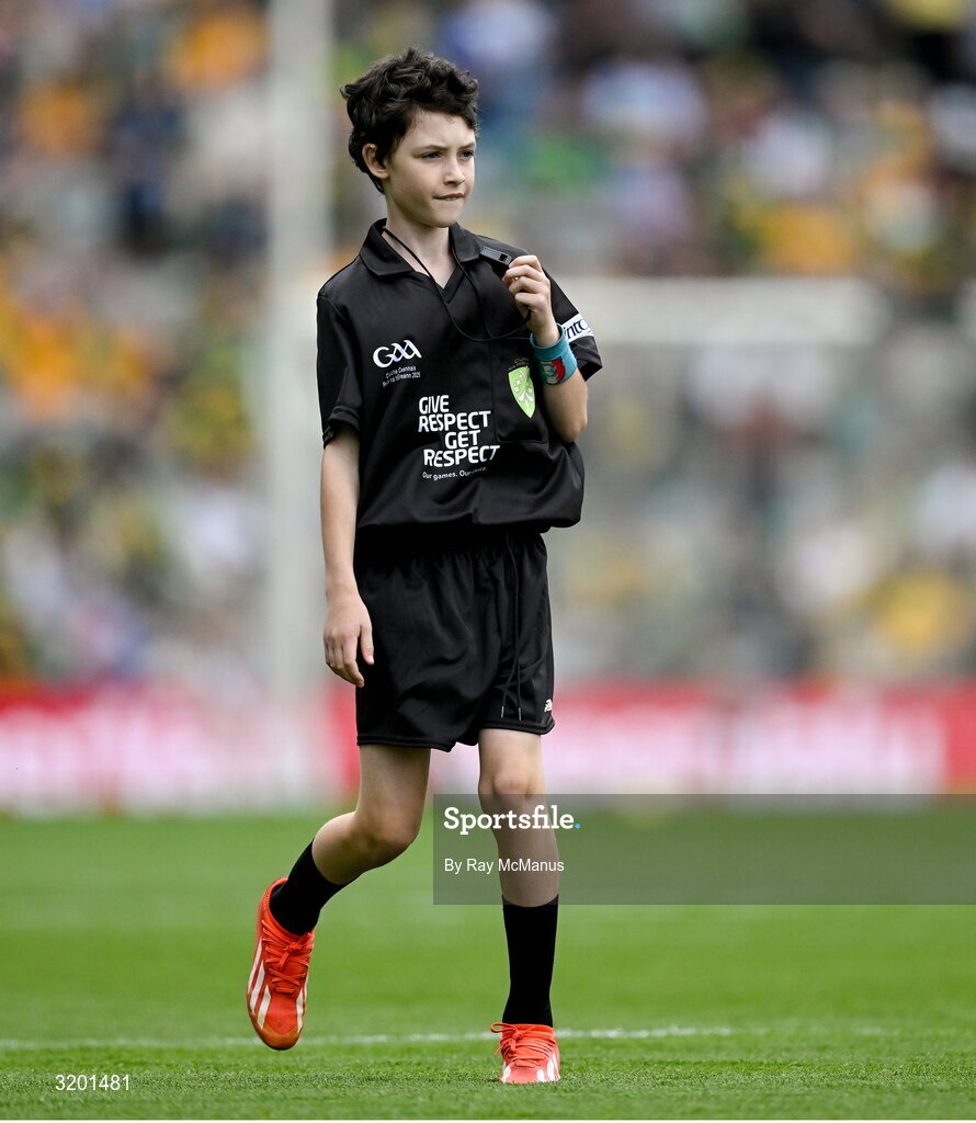 27 July 2025; Referee Daire Horgan, Holy Child Boys NS, Larkhill Road, Dublin, during the GAA INTO Cumann na mBunscol Respect Exhibition Go Games at the GAA Football All-Ireland Senior Championship final match between Kerry and Donegal at Croke Park in Dublin. Photo by Ray McManus/Sportsfile