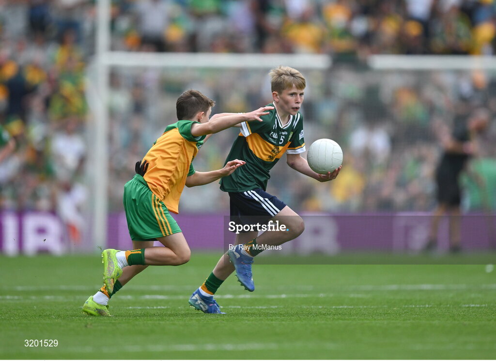 27 July 2025; Keelan Sweeney, St Andrews National School Curragha, representing Meath, is tackled by Marc Ó Gairbhí, Gaelscoil Ultain, Baile Mhuineacháin, Co. Mhuineacháin, representing Donegal, during the GAA INTO Cumann na mBunscol Respect Exhibition Go Games at the GAA Football All-Ireland Senior Championship final match between Kerry and Donegal at Croke Park in Dublin. Photo by Ray McManus/Sportsfile