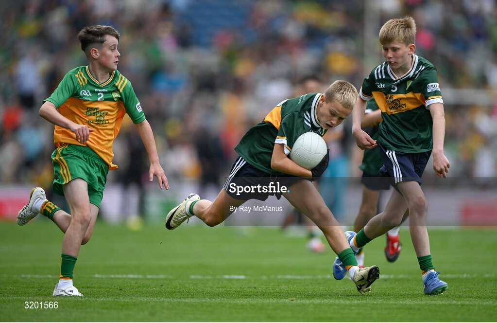27 July 2025; Calum Clarke, Scoil Mhuire agus Iosaf, Collooney, Sligo, representing Donegal, left, CJ Burke, St Joseph's National School, Mardyke, Cork, representing Kerry, and Marc Ó Gairbhí, Gaelscoil Ultain, Baile Mhuineacháin, Co. Mhuineacháin, representing Kerry, right, during the GAA INTO Cumann na mBunscol Respect Exhibition Go Games at the GAA Football All-Ireland Senior Championship final match between Kerry and Donegal at Croke Park in Dublin. Photo by Ray McManus/Sportsfile