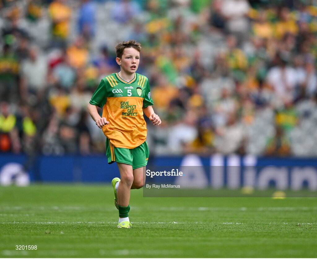 27 July 2025; Marc Ó Gairbhí, Gaelscoil Ultain, Baile Mhuineacháin, Co. Mhuineacháin, representing Donegal, during the GAA INTO Cumann na mBunscol Respect Exhibition Go Games at the GAA Football All-Ireland Senior Championship final match between Kerry and Donegal at Croke Park in Dublin. Photo by Ray McManus/Sportsfile