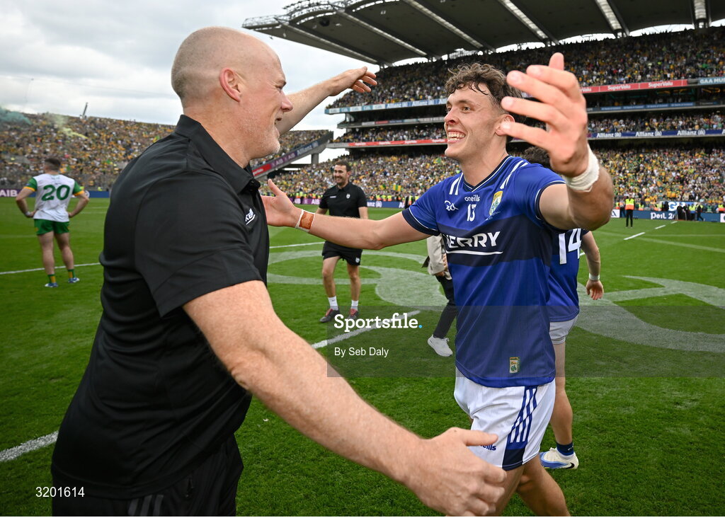 27 July 2025; David Clifford of Kerry, right, celebrates with selector James Costello after their side's victory in the GAA Football All-Ireland Senior Championship final match between Kerry and Donegal at Croke Park in Dublin. Photo by Seb Daly/Sportsfile