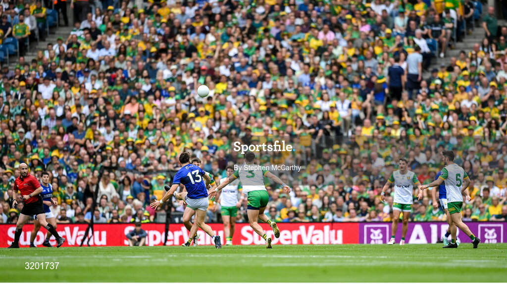 27 July 2025; David Clifford of Kerry kicks a two-pointer after the half-time hooter during the GAA Football All-Ireland Senior Championship final match between Kerry and Donegal at Croke Park in Dublin. Photo by Stephen McCarthy/Sportsfile