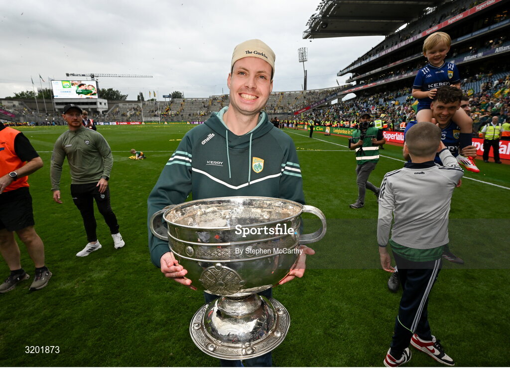27 July 2025; A Kerry supporter celebrates with the Sam Maguire cup after their side's victory in the GAA Football All-Ireland Senior Championship final match between Kerry and Donegal at Croke Park in Dublin. Photo by Stephen McCarthy/Sportsfile