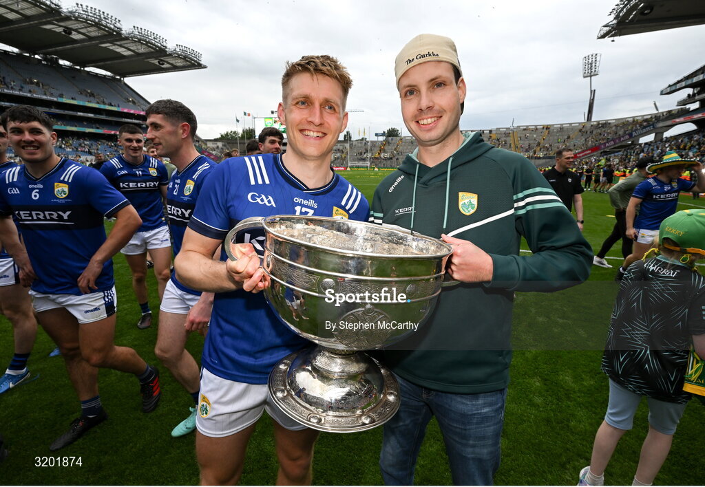 27 July 2025; Killian Spillane of Kerry celebrates with the Sam Maguire cup after their side's victory in the GAA Football All-Ireland Senior Championship final match between Kerry and Donegal at Croke Park in Dublin. Photo by Stephen McCarthy/Sportsfile