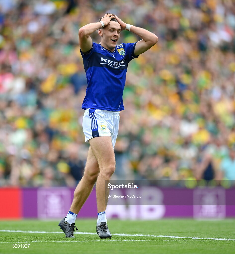 27 July 2025; David Clifford of Kerry reacts to a missed opportunity on goal during the GAA Football All-Ireland Senior Championship final match between Kerry and Donegal at Croke Park in Dublin. Photo by Stephen McCarthy/Sportsfile