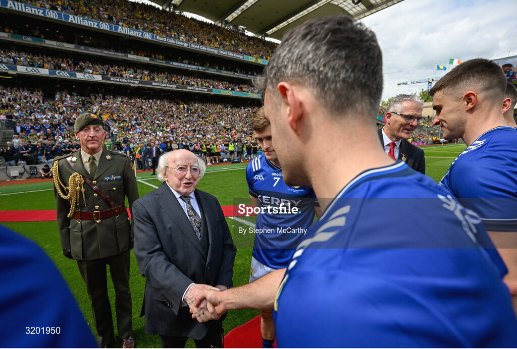 27 July 2025; President of Ireland Michael D Higgins shakes hands with Graham O'Sullivan of Kerry before the GAA Football All-Ireland Senior Championship final match between Kerry and Donegal at Croke Park in Dublin. Photo by Stephen McCarthy/Sportsfile
