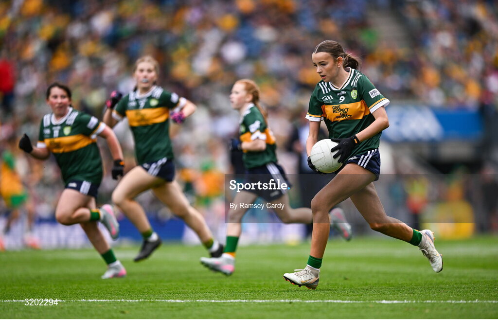 27 July 2025; Emily Kavanagh, St Colman's NS, Mucklagh, Offaly, representing Kerry, during the GAA INTO Cumann na mBunscol Respect Exhibition Go Games at the GAA Football All-Ireland Senior Championship final match between Kerry and Donegal at Croke Park in Dublin. Photo by Ramsey Cardy/Sportsfile