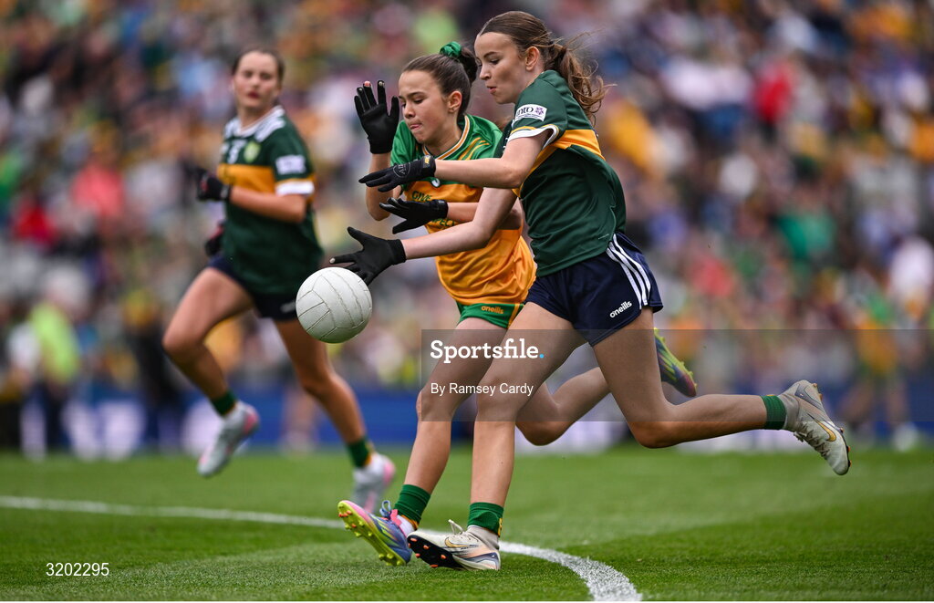 27 July 2025; Emily Kavanagh, St Colman's NS, Mucklagh, Offaly, representing Kerry, and Grace McGonigle, Gaelscoil Cois Feabhaill, Moville, Donegal, during the GAA INTO Cumann na mBunscol Respect Exhibition Go Games at the GAA Football All-Ireland Senior Championship final match between Kerry and Donegal at Croke Park in Dublin. Photo by Ramsey Cardy/Sportsfile