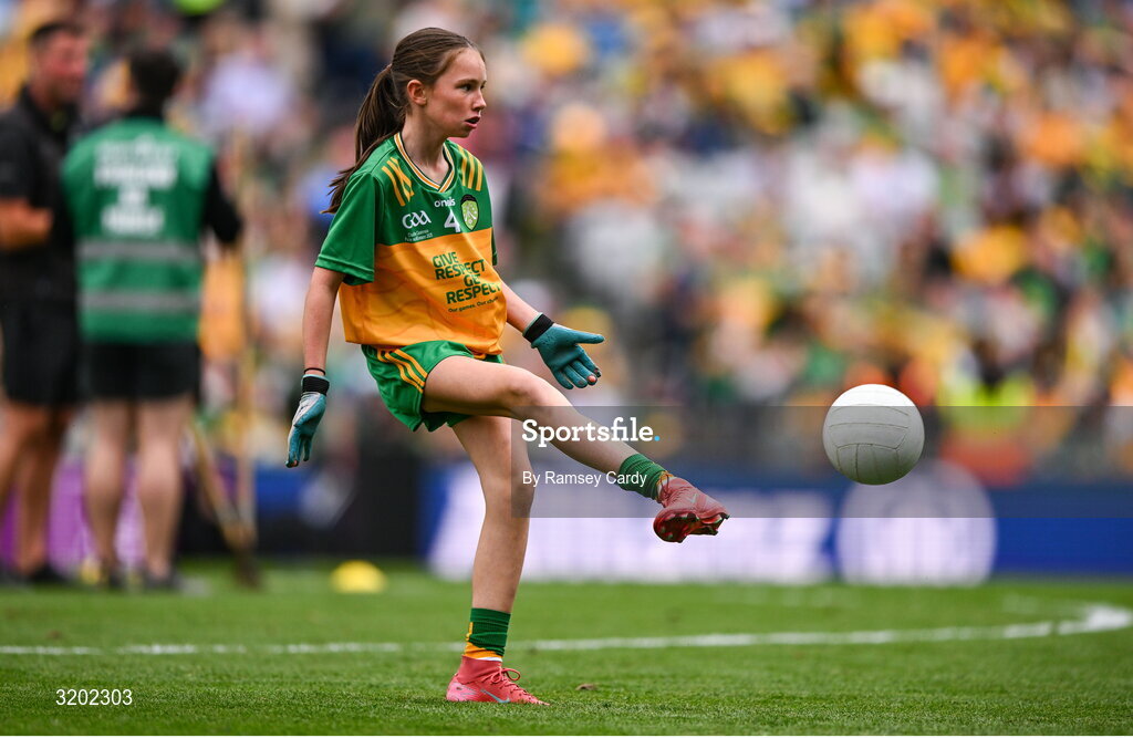 27 July 2025; Lucy Murphy, Breaffy NS, Breaffy, Mayo, representing Donegal, during the GAA INTO Cumann na mBunscol Respect Exhibition Go Games at the GAA Football All-Ireland Senior Championship final match between Kerry and Donegal at Croke Park in Dublin. Photo by Ramsey Cardy/Sportsfile