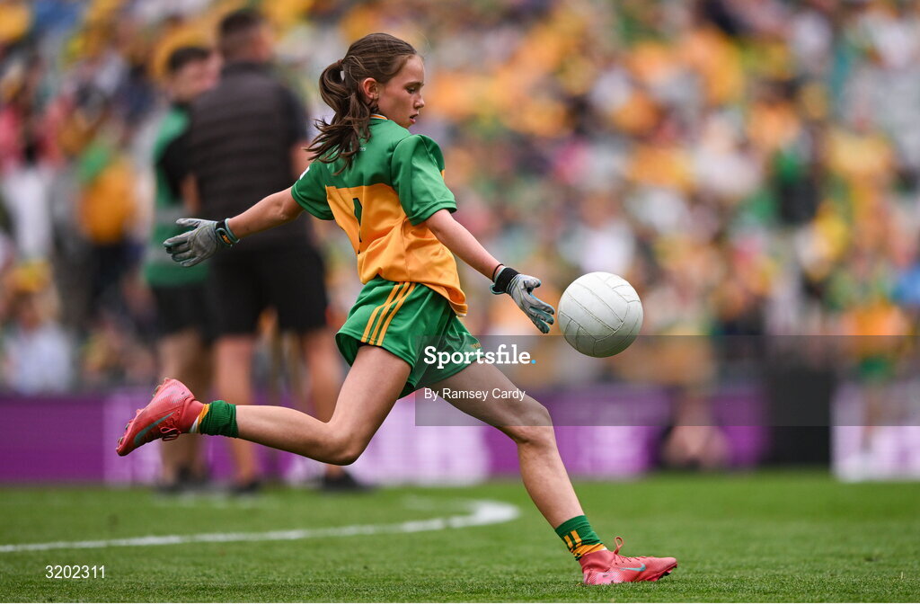 27 July 2025; Lucy Murphy, Breaffy NS, Breaffy, Mayo, representing Donegal, during the GAA INTO Cumann na mBunscol Respect Exhibition Go Games at the GAA Football All-Ireland Senior Championship final match between Kerry and Donegal at Croke Park in Dublin. Photo by Ramsey Cardy/Sportsfile