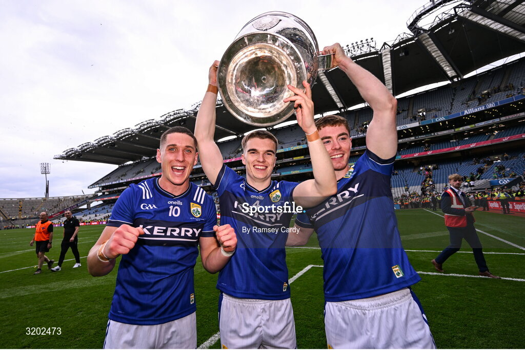 27 July 2025; Kerry players, from left, Joe O'Connor, Dylan Casey and Armin Heinrich after the GAA Football All-Ireland Senior Championship final match between Kerry and Donegal at Croke Park in Dublin. Photo by Ramsey Cardy/Sportsfile
