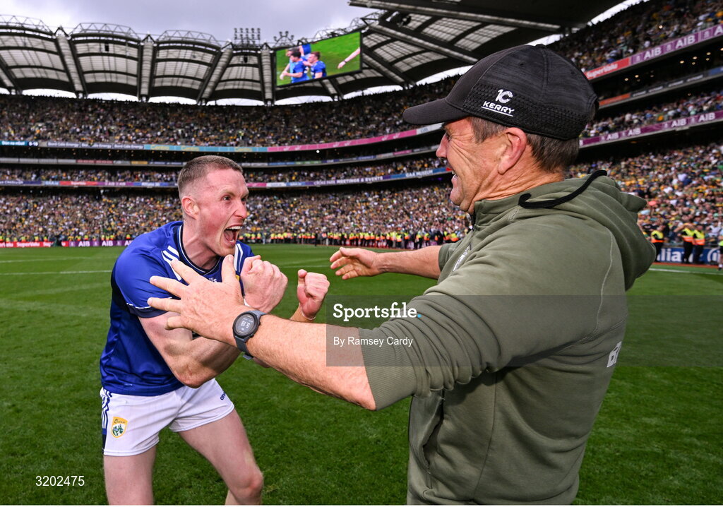27 July 2025; Kerry manager Jack O'Connor celebrates with Jason Foley of Kerry after the GAA Football All-Ireland Senior Championship final match between Kerry and Donegal at Croke Park in Dublin. Photo by Ramsey Cardy/Sportsfile