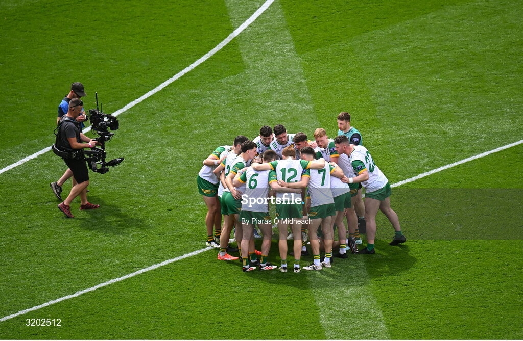 27 July 2025; Donegal captain Patrick McBrearty, 22, with his team-mates in a huddle before the GAA Football All-Ireland Senior Championship final match between Kerry and Donegal at Croke Park in Dublin. Photo by Piaras Ó Mídheach/Sportsfile