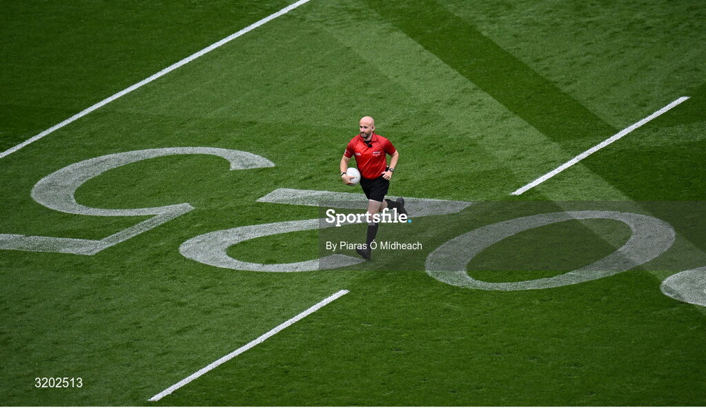 27 July 2025; Referee Brendan Cawley before the GAA Football All-Ireland Senior Championship final match between Kerry and Donegal at Croke Park in Dublin. Photo by Piaras Ó Mídheach/Sportsfile