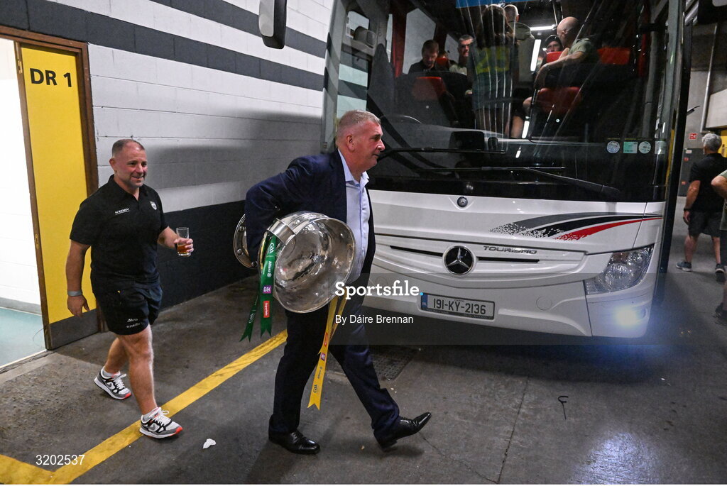27 July 2025; Kerry County Board chairman Patrick O'Sullivan and Head of athletic development Jason McGahan bring the Sam Maguire cup out of the dressing-room after the GAA Football All-Ireland Senior Championship final match between Kerry and Donegal at Croke Park in Dublin. Photo by Daire Brennan/Sportsfile