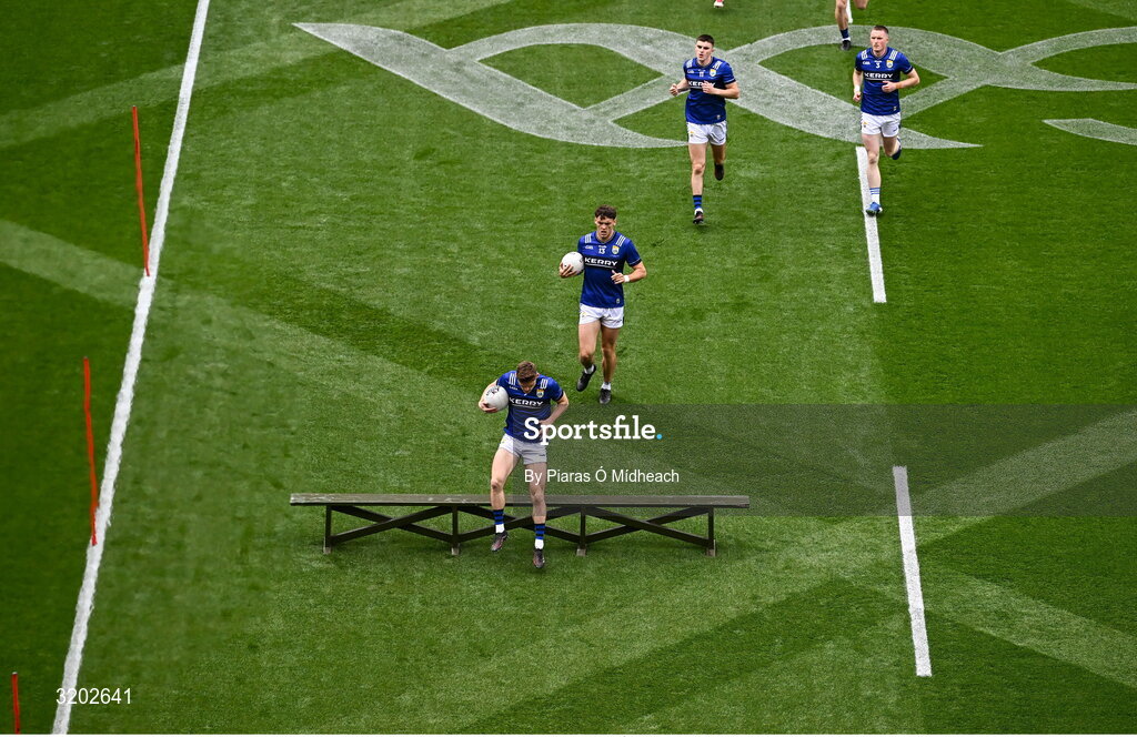 27 July 2025; Kerry captain Gavin White jumps onto the bench for the team photograph before the GAA Football All-Ireland Senior Championship final match between Kerry and Donegal at Croke Park in Dublin. Photo by Piaras Ó Mídheach/Sportsfile