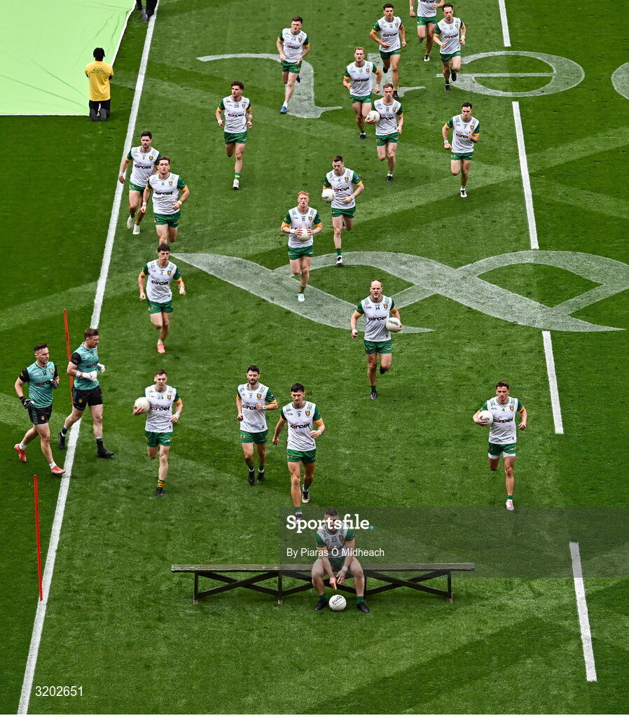 27 July 2025; Donegal captain Patrick McBrearty leads his team-mates to the bench for the pre-match squad photograph before the GAA Football All-Ireland Senior Championship final match between Kerry and Donegal at Croke Park in Dublin. Photo by Piaras Ó Mídheach/Sportsfile Photo by Piaras Ó Mídheach/Sportsfile