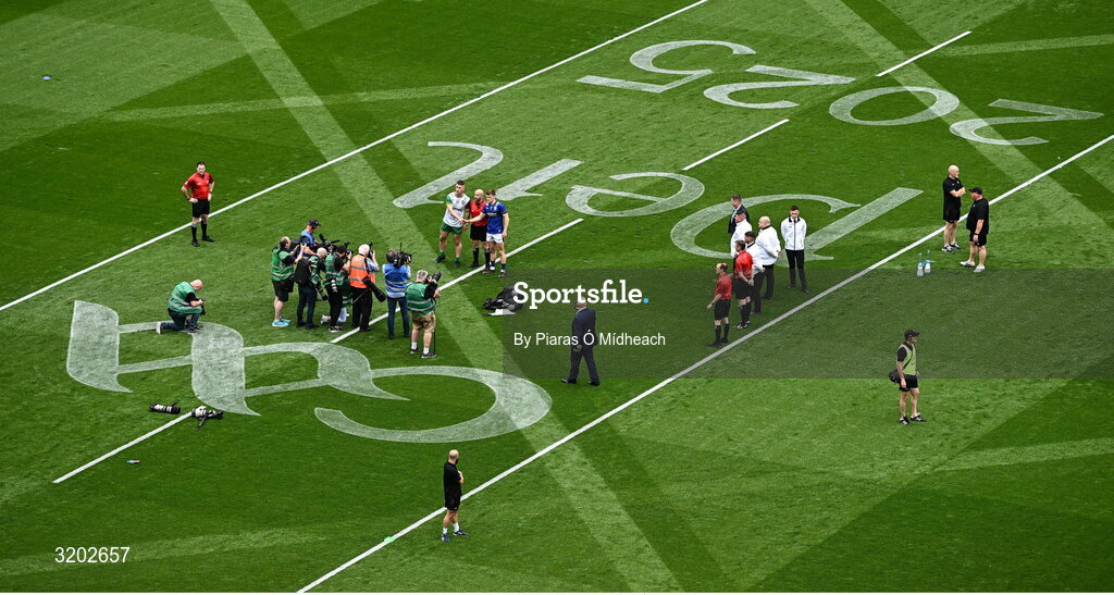 27 July 2025; Referee Brendan Cawley with team captains Gavin White of Kerry and Patrick McBrearty of Donegal before the GAA Football All-Ireland Senior Championship final match between Kerry and Donegal at Croke Park in Dublin. Photo by Piaras Ó Mídheach/Sportsfile