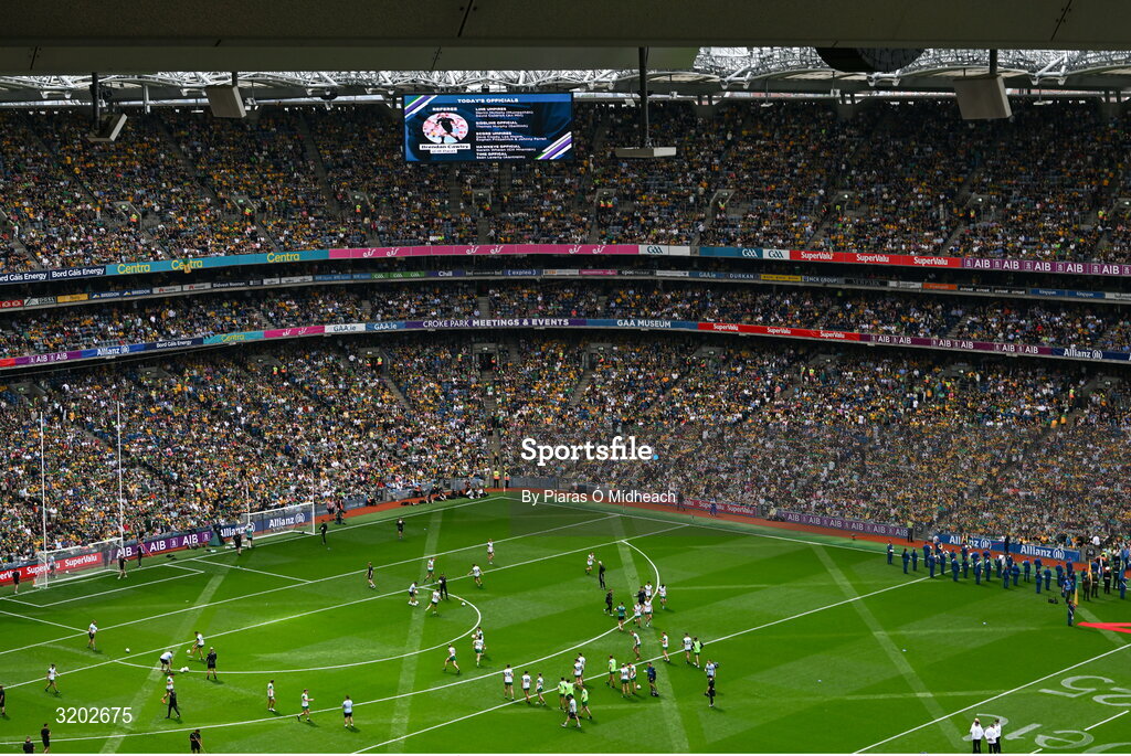 27 July 2025; Donegal players warm-up before the GAA Football All-Ireland Senior Championship final match between Kerry and Donegal at Croke Park in Dublin. Photo by Piaras Ó Mídheach/Sportsfile