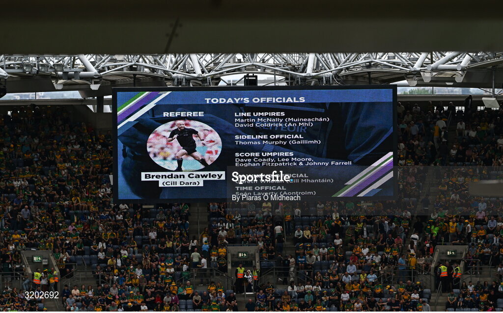 27 July 2025; Referee Brendan Cawley and his match officials are shown on the big screen before the GAA Football All-Ireland Senior Championship final match between Kerry and Donegal at Croke Park in Dublin. Photo by Piaras Ó Mídheach/Sportsfile